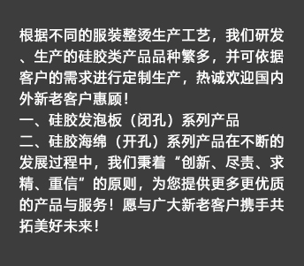 我公司生產(chǎn)的硅膠海綿(開孔)系列產(chǎn)品具有耐高溫、透氣性好、耐壓性強(qiáng)等優(yōu)點(diǎn),是西服及高檔服裝整燙生產(chǎn)的必備產(chǎn)品。硅膠發(fā)泡板(閉孔)系列產(chǎn)品具有發(fā)泡均勻,耐高溫、耐壓性能好,其中新研制開發(fā)的針孔浮點(diǎn)硅膠發(fā)泡板攻克了一般產(chǎn)品的浮點(diǎn)不飽滿的技術(shù)難題,一般產(chǎn)品的浮點(diǎn)不飽滿,容易擋住透氣孔,造成吸風(fēng)效果不良。我司的產(chǎn)品具有更好的透氣性和回彈性,以及更長時(shí)間的試用壽命。